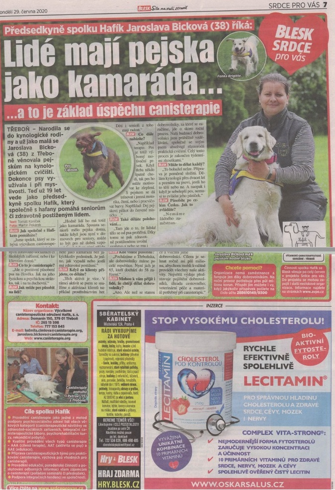 Dnes v "Blesku" vyšel poslední ze série článků o našem Výcvikovém canisterapeutickém sdružení Hafík, z.s. Prostřednictvím naší úžasné předsedkyně Jaroslavy Bickové, která je srdcem Hafíka, se dozvíte, jak z.s. Hafík funguje. Jájo, děkujeme za vše, co pro Hafíka děláš, bez Tebe by nebyl tím, čím je!