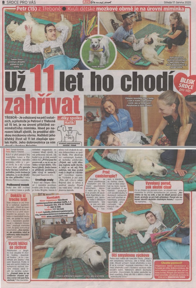 Představení činnosti našeho Výcvikového canisterapeutického sdružení Hafík, z.s. v "Blesku" pokračuje:) Dnes si můžete přečíst příběh o tom, jak konkrétně může pejsek pomáhat. Děkujeme za možnost sdílet tento příběh s Vámi všemi, které naše činnost zajímá. Individuální docházení do rodiny bylo realizováno za podpory projektu Ministerstva školství, mládeže a tělovýchovy - Život je pes a proto žít je psina.