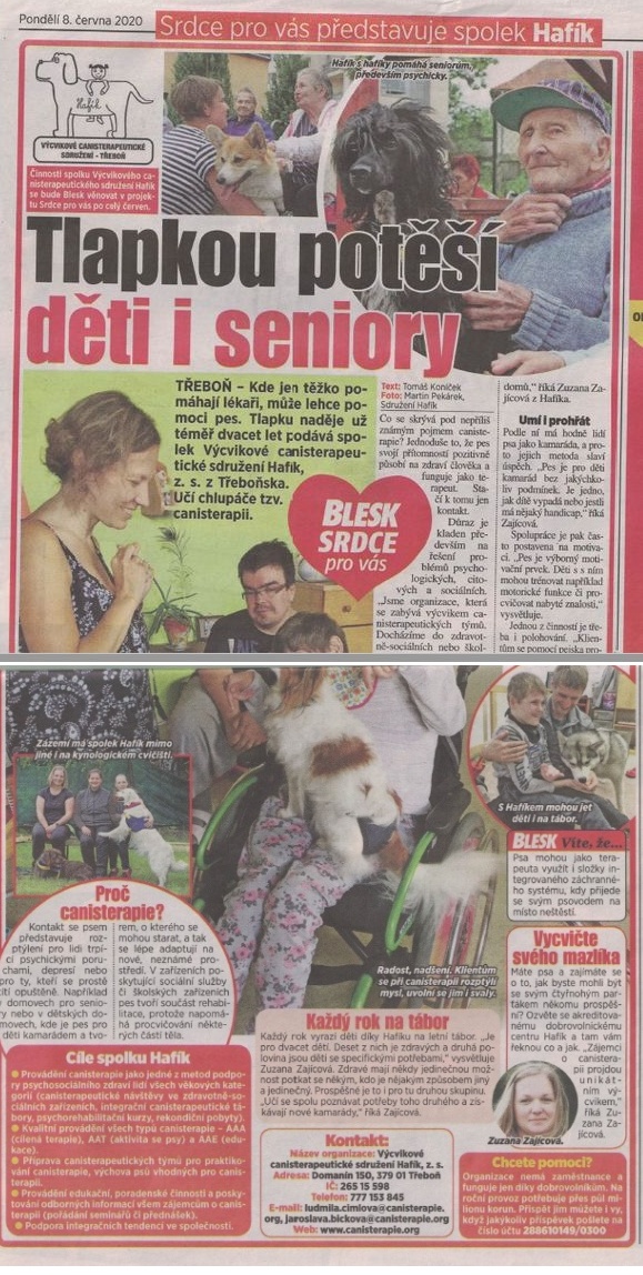Dnes vyšel v "Blesku" první ze série plánovaných článků o našem Výcvikovém canisterapeutickém sdružení Hafík, z.s. Pokud máte zájem se o nás a naší činnosti dozvědět více, tak určitě doporučujeme:)