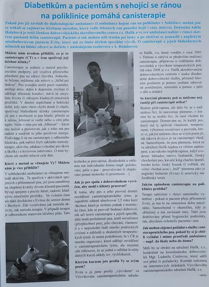 Naše dobrovolnice Adéla Holubová měla čest poskytnout rozhovor týkající se canisterapie v ambulanci DiaPodi care do soběslavského měsíčníku Hláska. Moc děkujeme Adéle za prezentaci "Hafíka" a za její čas vložený do praktikování canisterapie.
