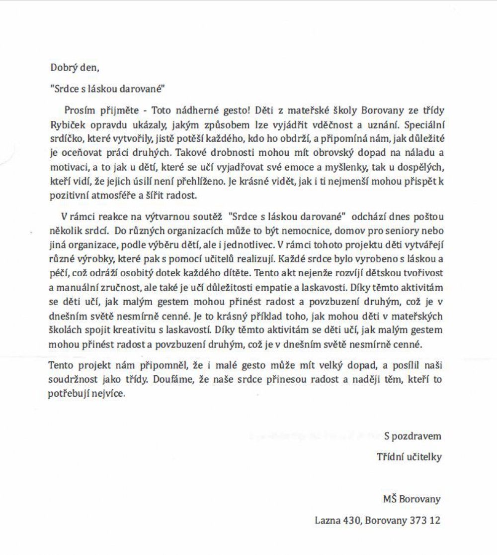 Rádi bychom vyjádřili obrovské poděkování dětem ze třídy Rybiček z Mateřské školy Borovany. Získali jsme od nich nádhernou odměnu za naši práci. Velice si vážíme úžasného gesta, kdy jsme dostali jedno z jejich vyrobených srdcí v rámci projektu "Srdce s láskou darované". A nešlo jen o darované srdce, součástí byl i krásný dopis. Děkujeme.